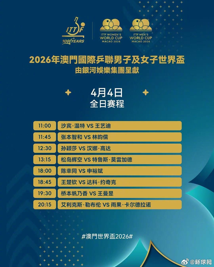 【来了!#澳门世界杯今日赛程#】澳门乒乓球世界杯4月4日赛程来了!@孙颖莎 @王楚钦___ @王曼昱 @陈幸同 @王艺迪 等将出战,一起期待!#孙颖莎王楚钦王曼昱等今日出战#
