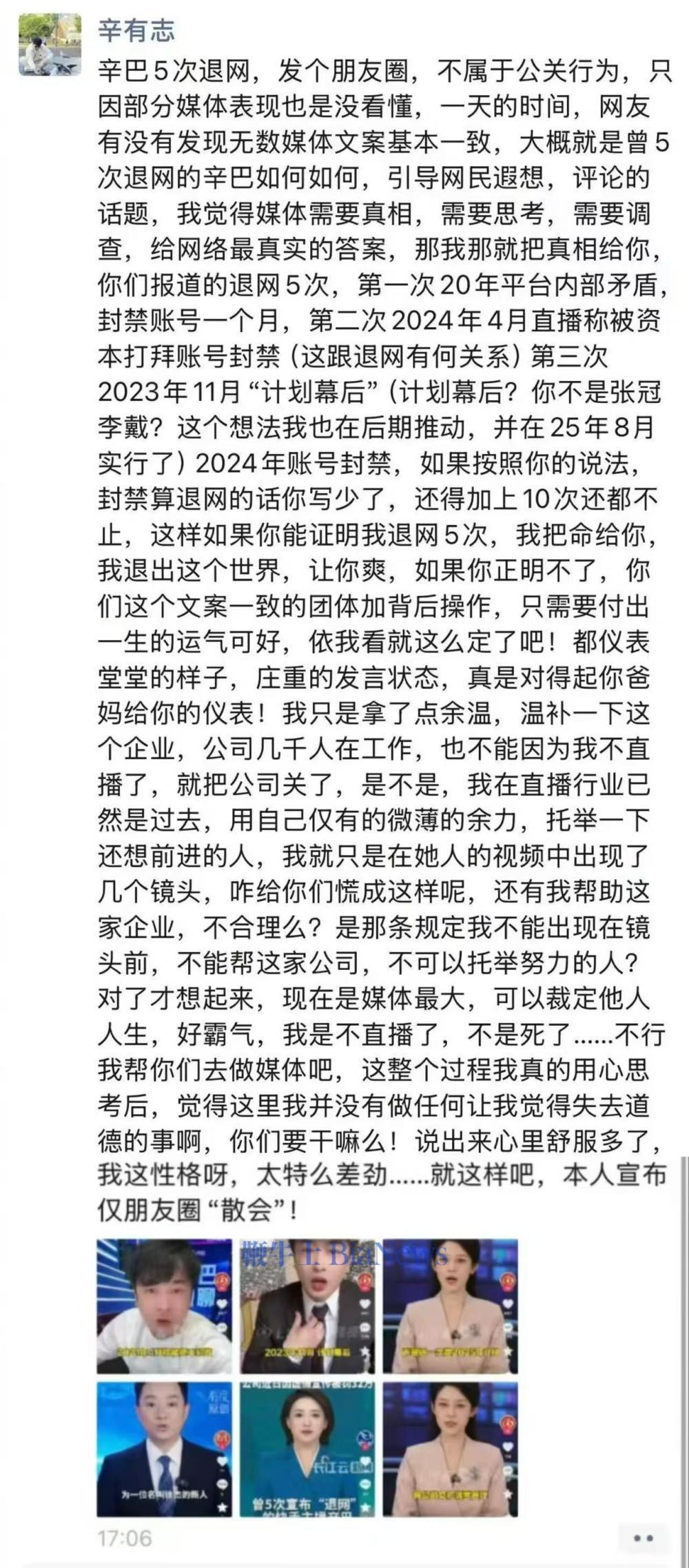 4 月 7 日,快手头部主播辛巴(辛有志)在朋友圈发长文否认 5 次退网。